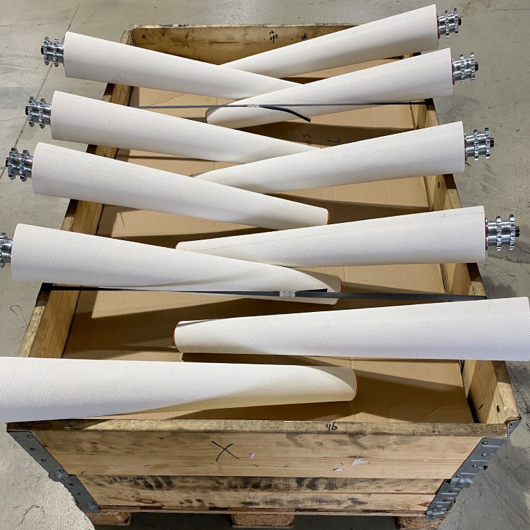 Wanneer het noodzakelijk is om aandrijf- en/of retour trommels (rollen) te bekleden met antislip materiaal, verzorgen wij dit graag voor u.